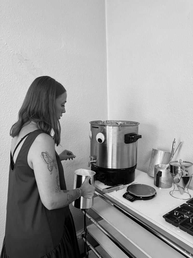 Our wild journey began in our little kitchen during the thick of the pandemic. With a toddler under our feet, three cats, two dogs, and not a lot of spare time —or money— we started pouring a few candles each evening using the hob. We were posting every day across four different social media platforms and hitting markets across the UK every single week to help grow the brand from the ground up. We hand-delivered every local order ourselves and took IKEA bags full of parcels to the post office each evening. Slowly but surely, the word started to spread and then orders came flooding in fast. So we got imaginative. We built our own makeshift machinery from bits and bobs just to keep up. It was chaotic, exciting, and completely life-changing.